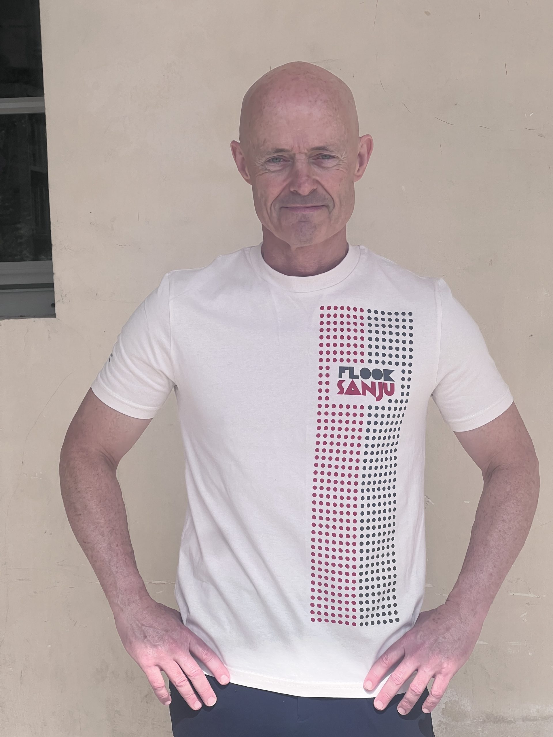 High quality organic t shirt by Stanley/Stella, featuring the Flook Sanju logo. Printed with eco-friendly water based ink. Colour is VINTAGE WHITE.